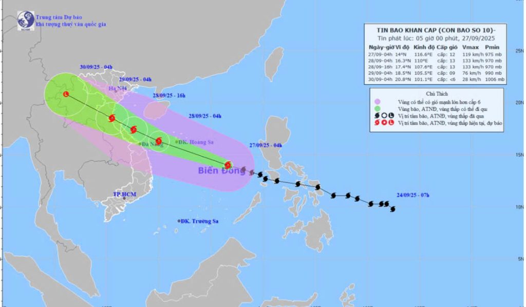Theo tin từ Đài Khí tượng thủy văn Trung bộ, lúc 4h ngày 27/9, tâm bão số 10 ở vị trí 14,0°N – 116,6°E, cách đặc khu Hoàng Sa khoảng 580 km về phía Đông Đông Nam, sức gió mạnh nhất cấp 11–12 (103–133 km/h), giật cấp 15, di chuyển theo hướng Tây Tây Bắc tốc độ 35–40 km/h.
